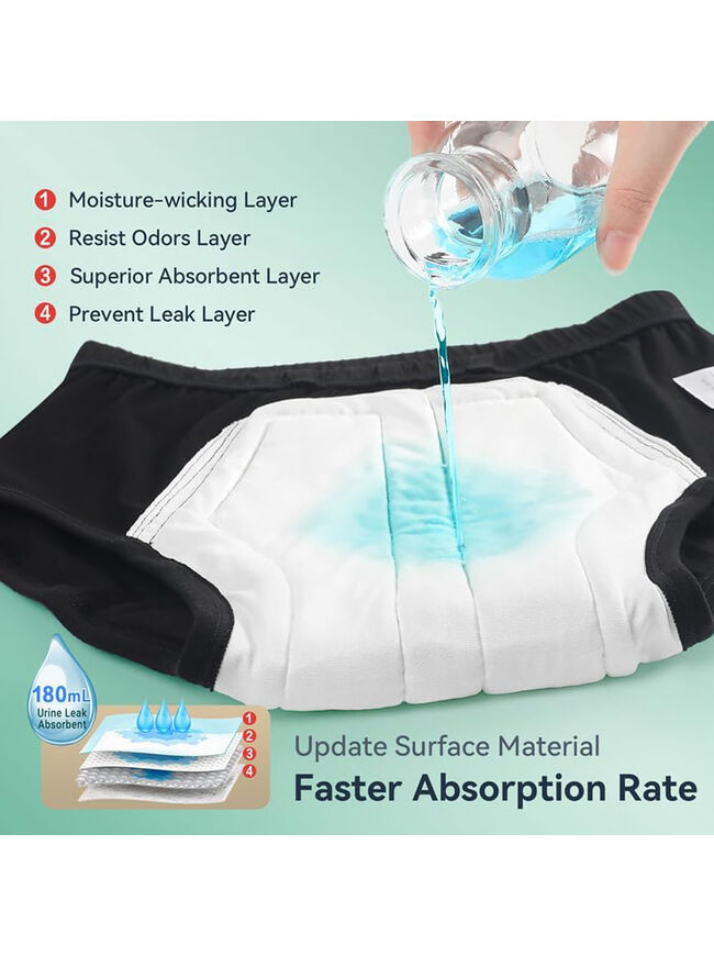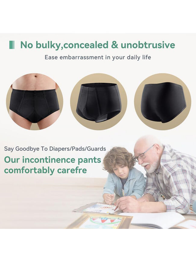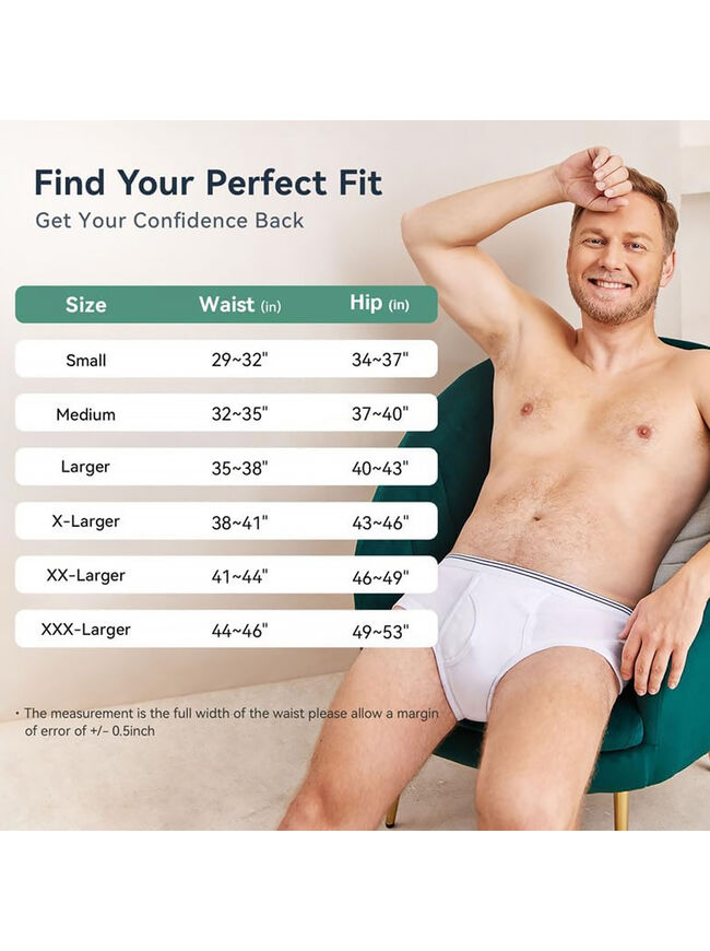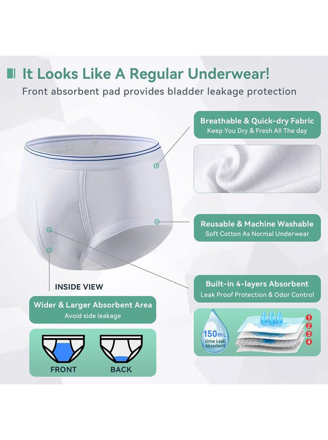 PADRAM Mens Incontinence Briefs 2 Pack - Washable, Front Absorbent (White, M)